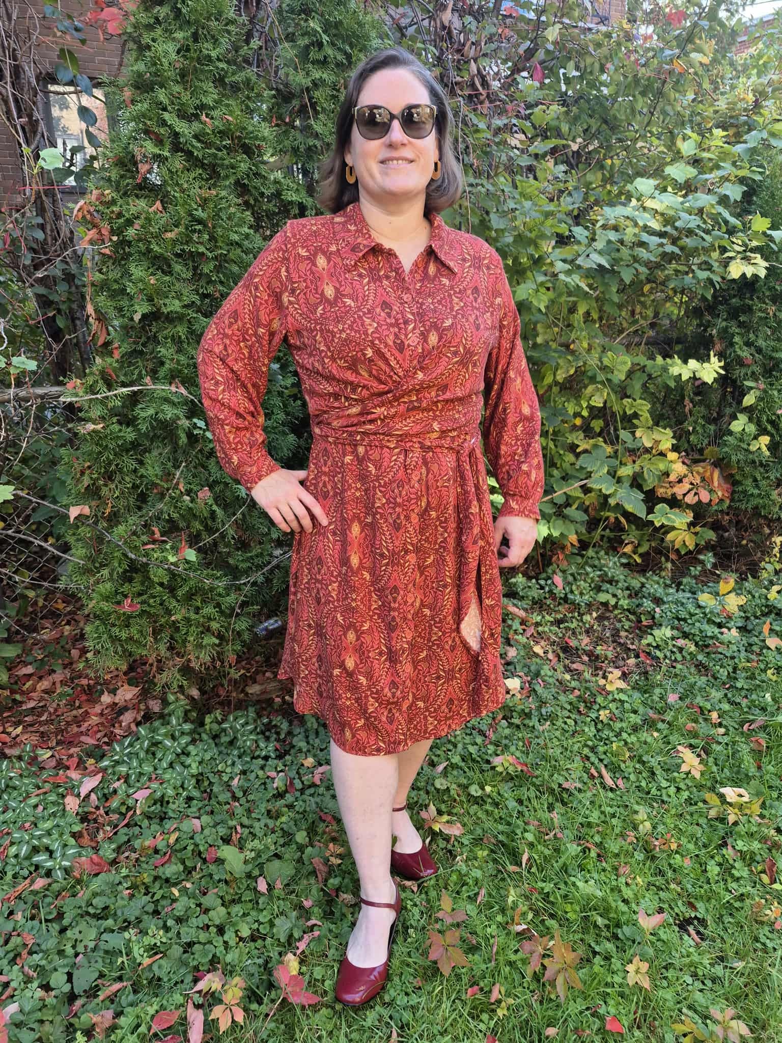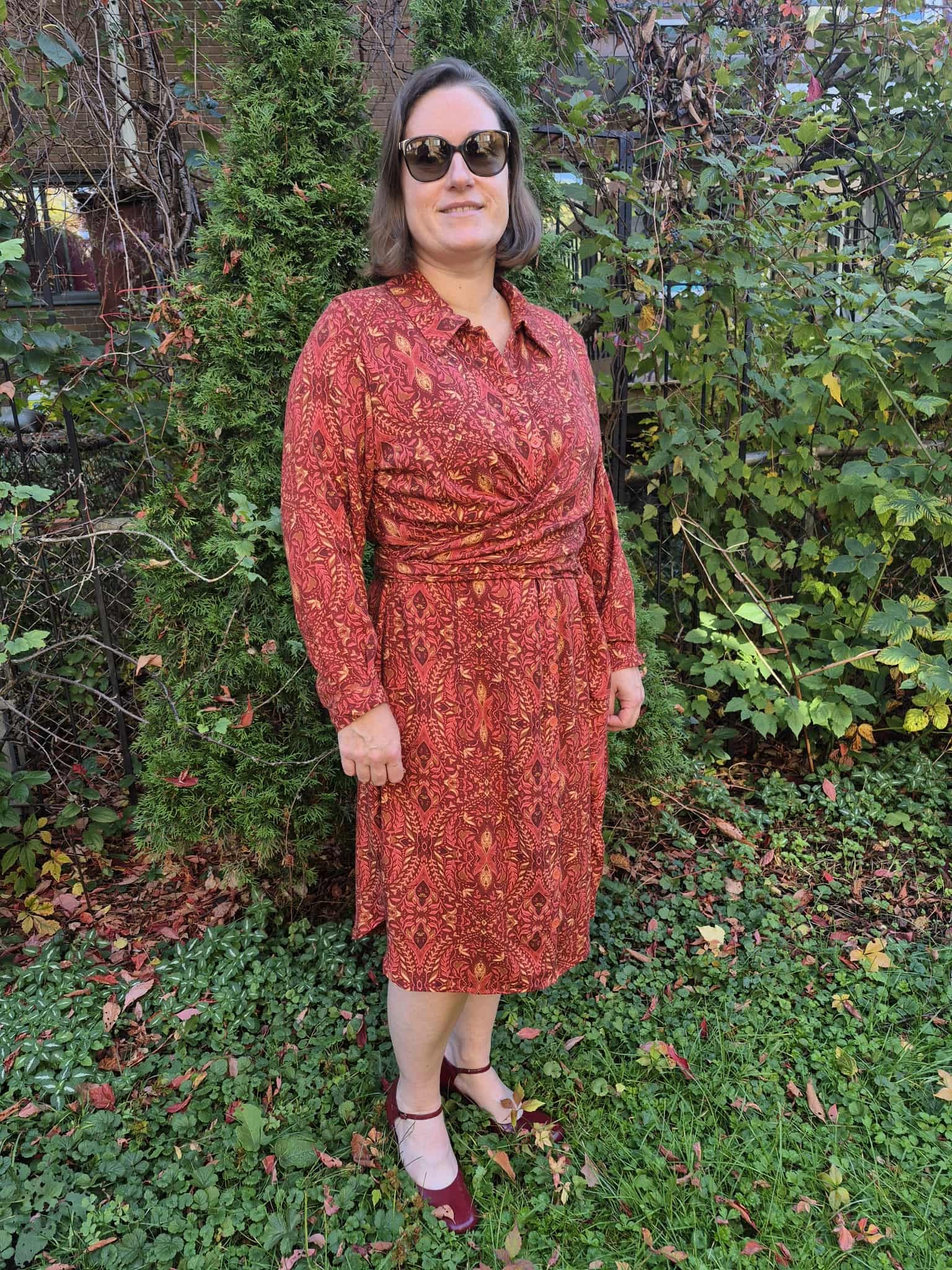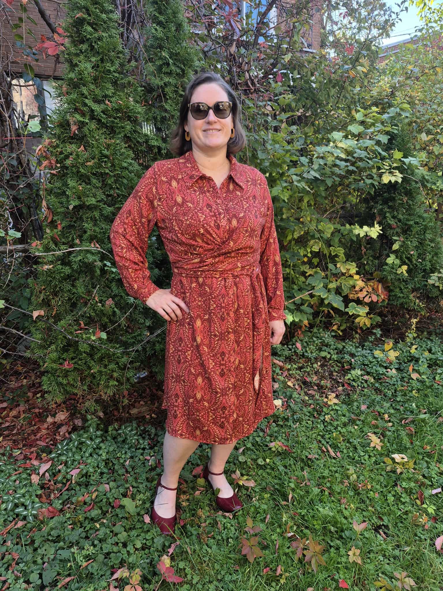 Originally, I made the longer version of the dress, hoping for a dramatic Fall silhouette. However, once finished, I found that the length felt a little overwhelming on my petite frame. So, I shortened the hem by a few inches—and I’m so glad I did! It now feels more balanced and wearable. I also adjusted the shoulder seams slightly, raising them to minimize the drop-shoulder effect, which didn’t quite suit me.