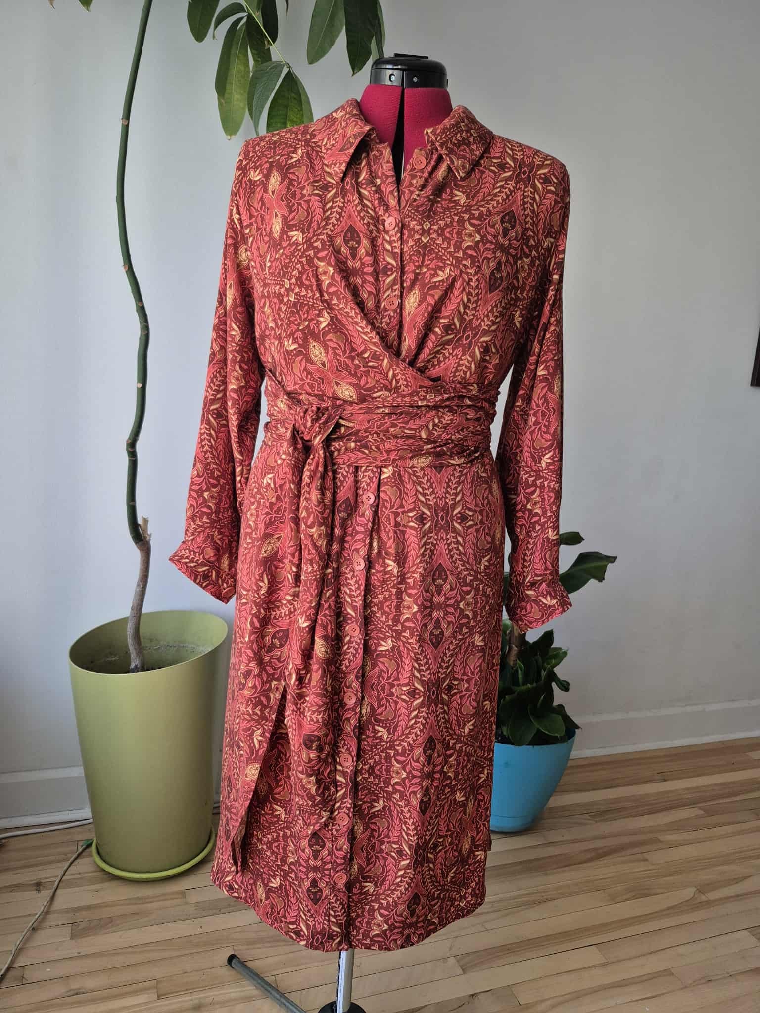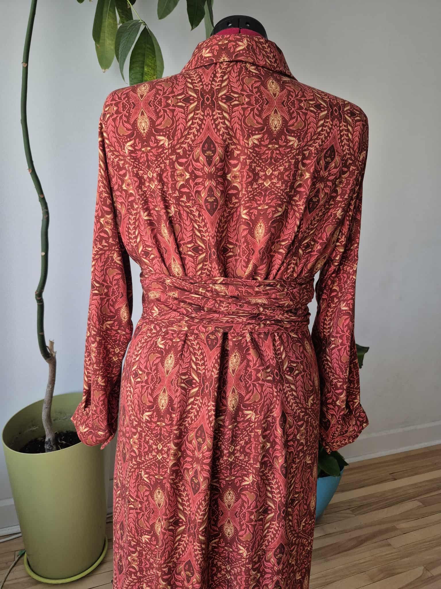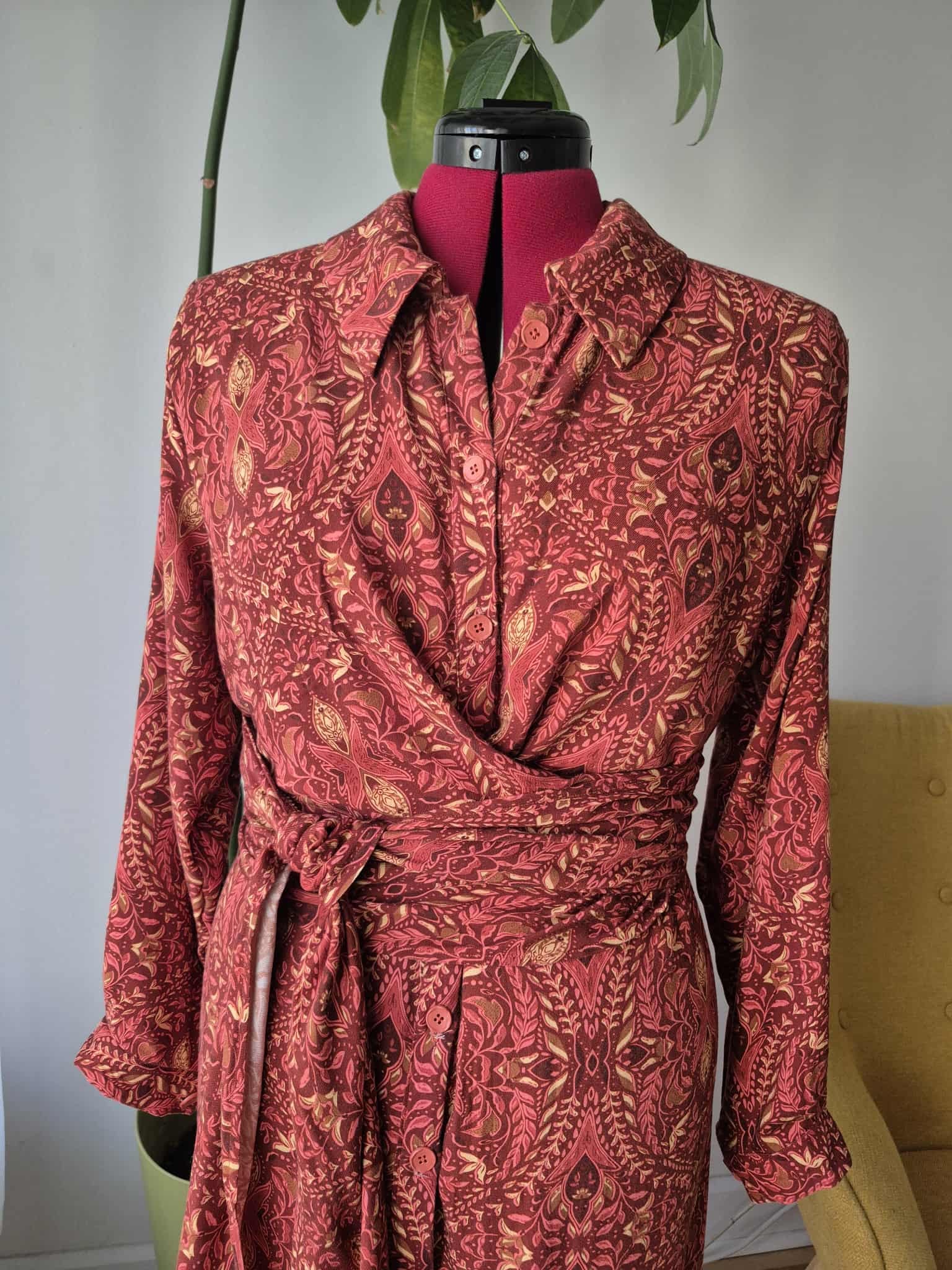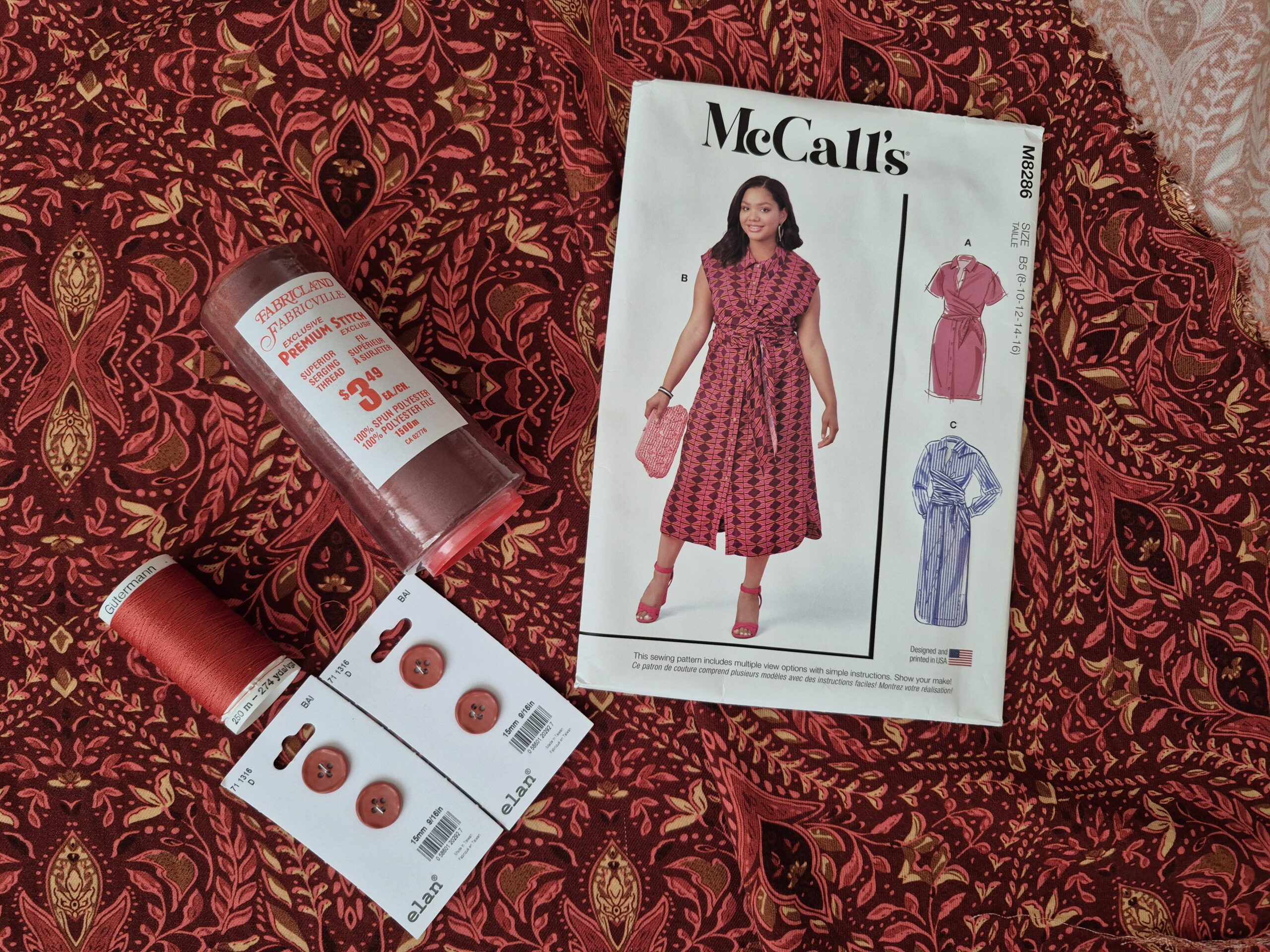 For this project, I knew I wanted a fabric that felt luxurious and warm but still had a beautiful drape. I chose this stunning wine-colored rayon twill print from Fabricville’s Fall/Winter 2025 collection. The rich tone is perfect for Autumn, and the fabric itself is incredibly soft with just the right amount of movement—making it an ideal match for the pattern.