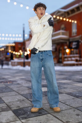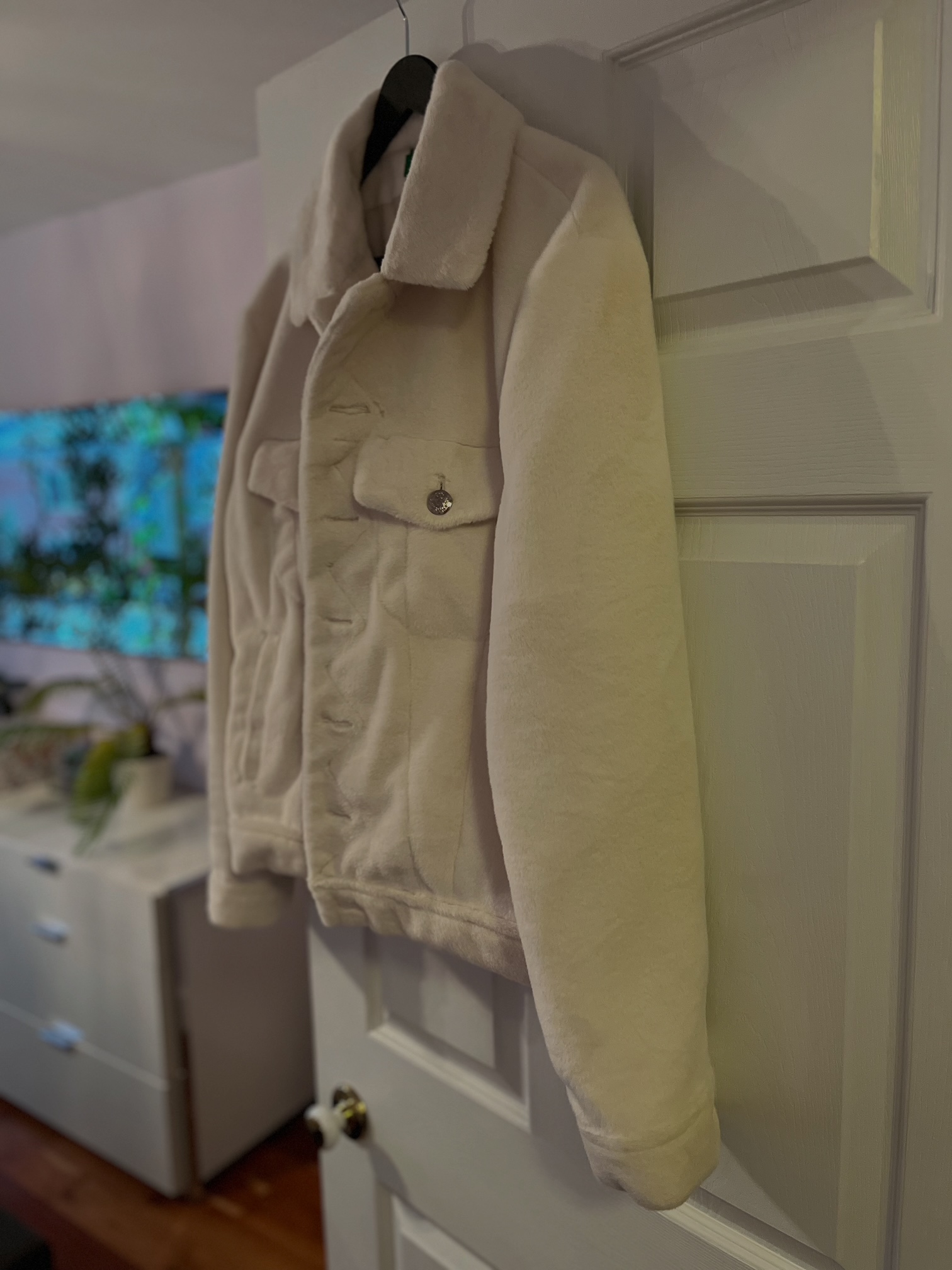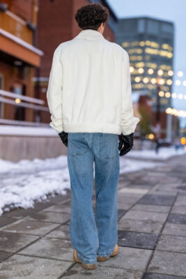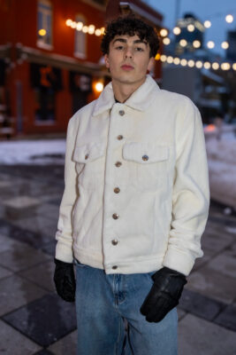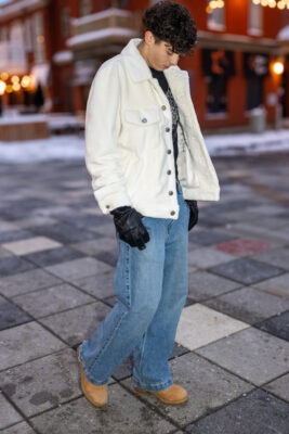 The universe smiled on me when it came time for the photoshoot—the first snow of the season arrived just as the jacket was finished! Unfortunately, my oldest son, the intended recipient, was tied up with school. So, my youngest stepped in to model it for us… and now I’m afraid this faux white mink fur trucker jacket might end up permanently in the wrong closet!