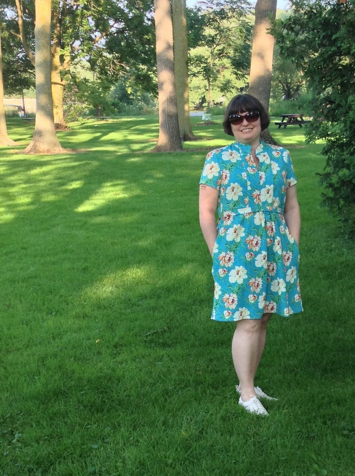 The only thing I’m not 100% sure about is the collar. It seems really high on the neck, at least with my short little neck, and I may still remove it and just bind the round neck with some bias at some point in the future. I’ll wear it a bit first and see if it bothers me. In any case, I love this beautiful Fabricville project – the colours in the fabric are bright and crisp, and it sewed up very neatly.