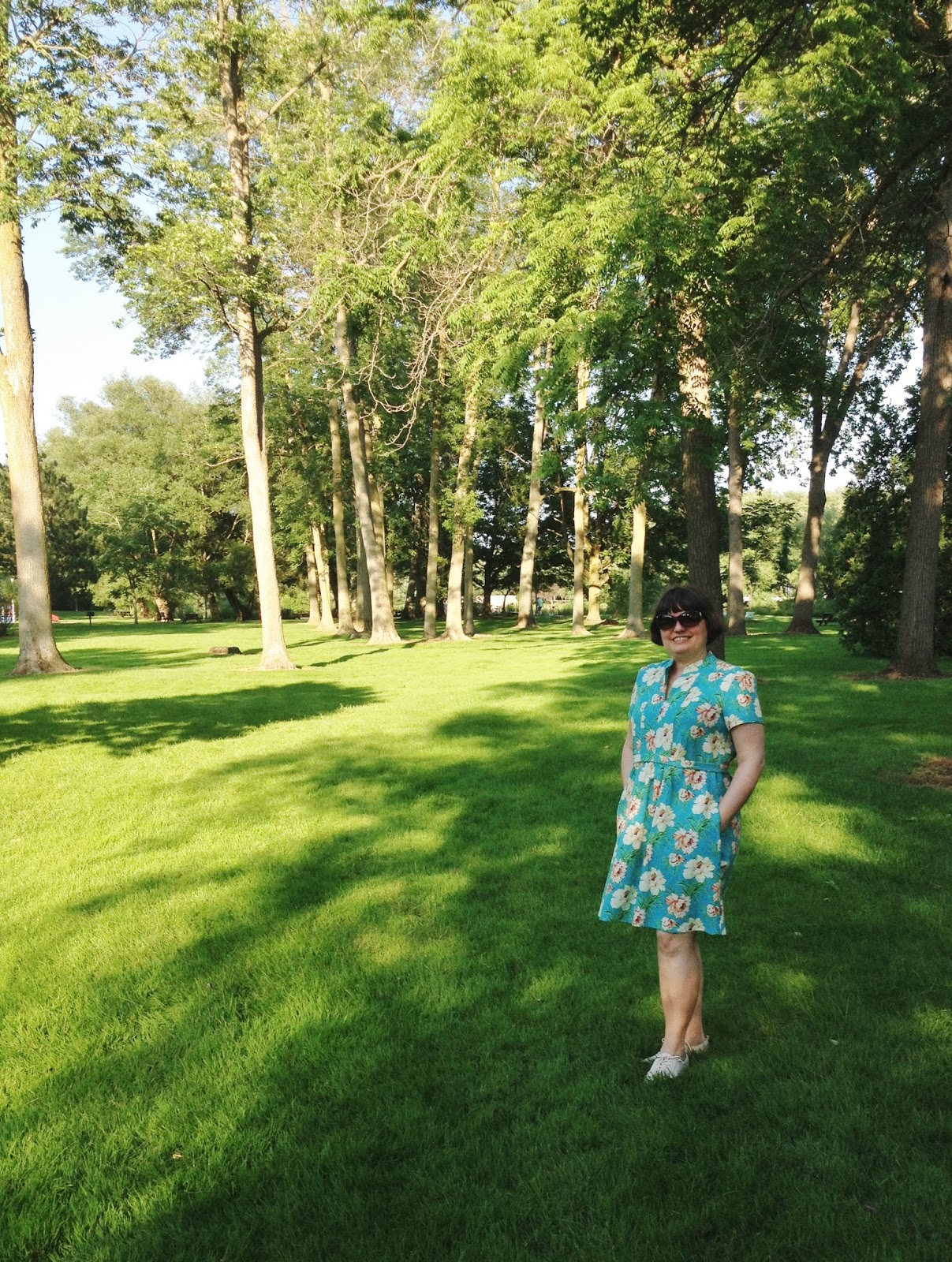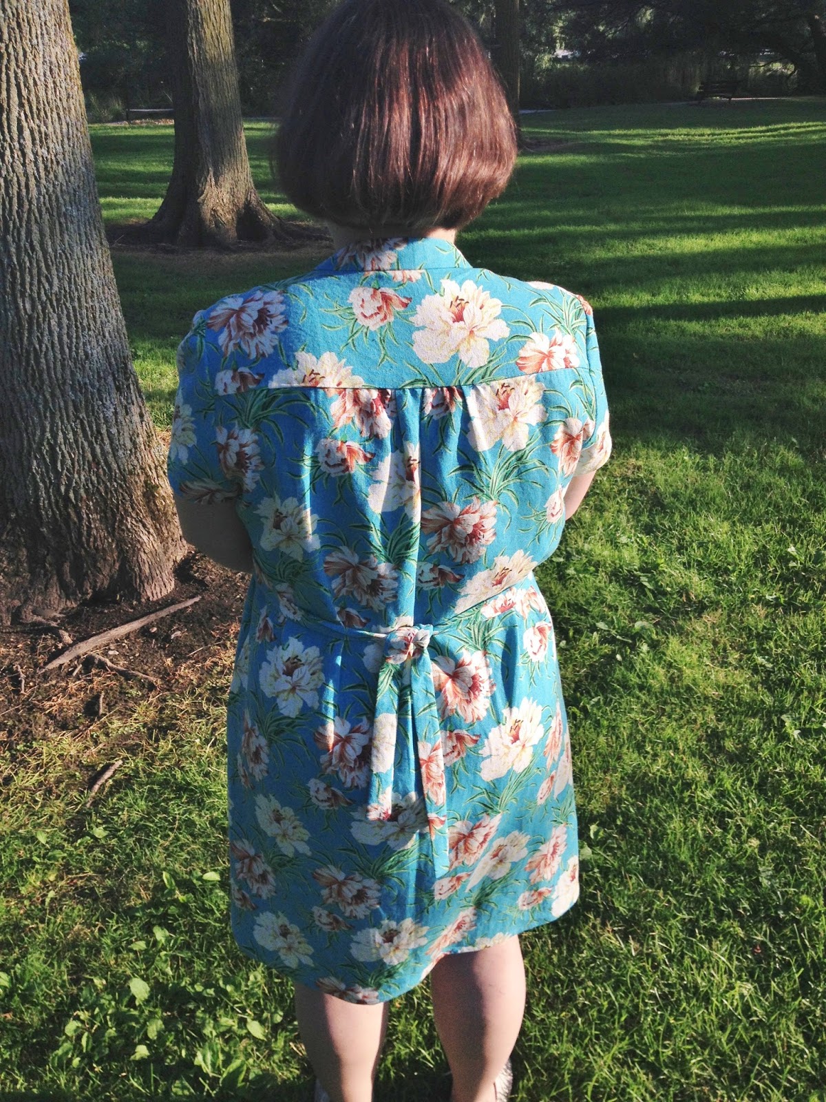 Luckily for me the interesting belt covers most of the seam line at the bottom of that front panel anyhow! It’s a narrow tie belt, and for this view, it is simply attached by stitching a straight line down the centre, on top of the centre seam between the panels. Easy as pie! I’m not usually a huge fan of butt bows but this one really works, I think — the dress is too full not to have a belt, and tying it loosely and with a knot instead of a bow, reduces the sweet factor. Also, I don’t think you’d be able to tie much of a bow unless you fastened it a lot more closely than I did, so if you are thinking of making this I’d recommend lengthening the ties if you want a bow.