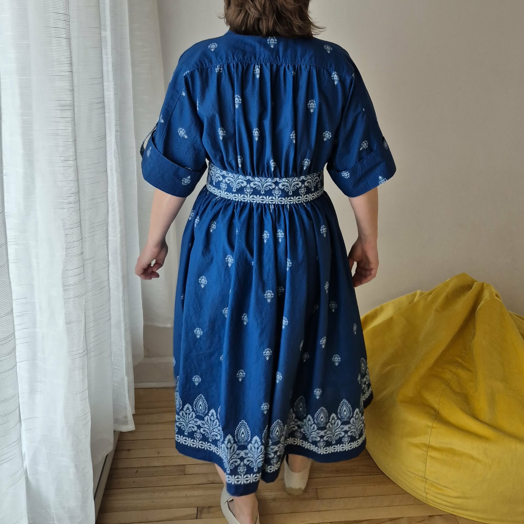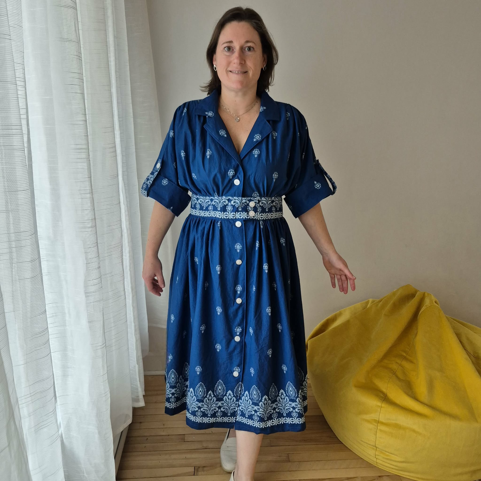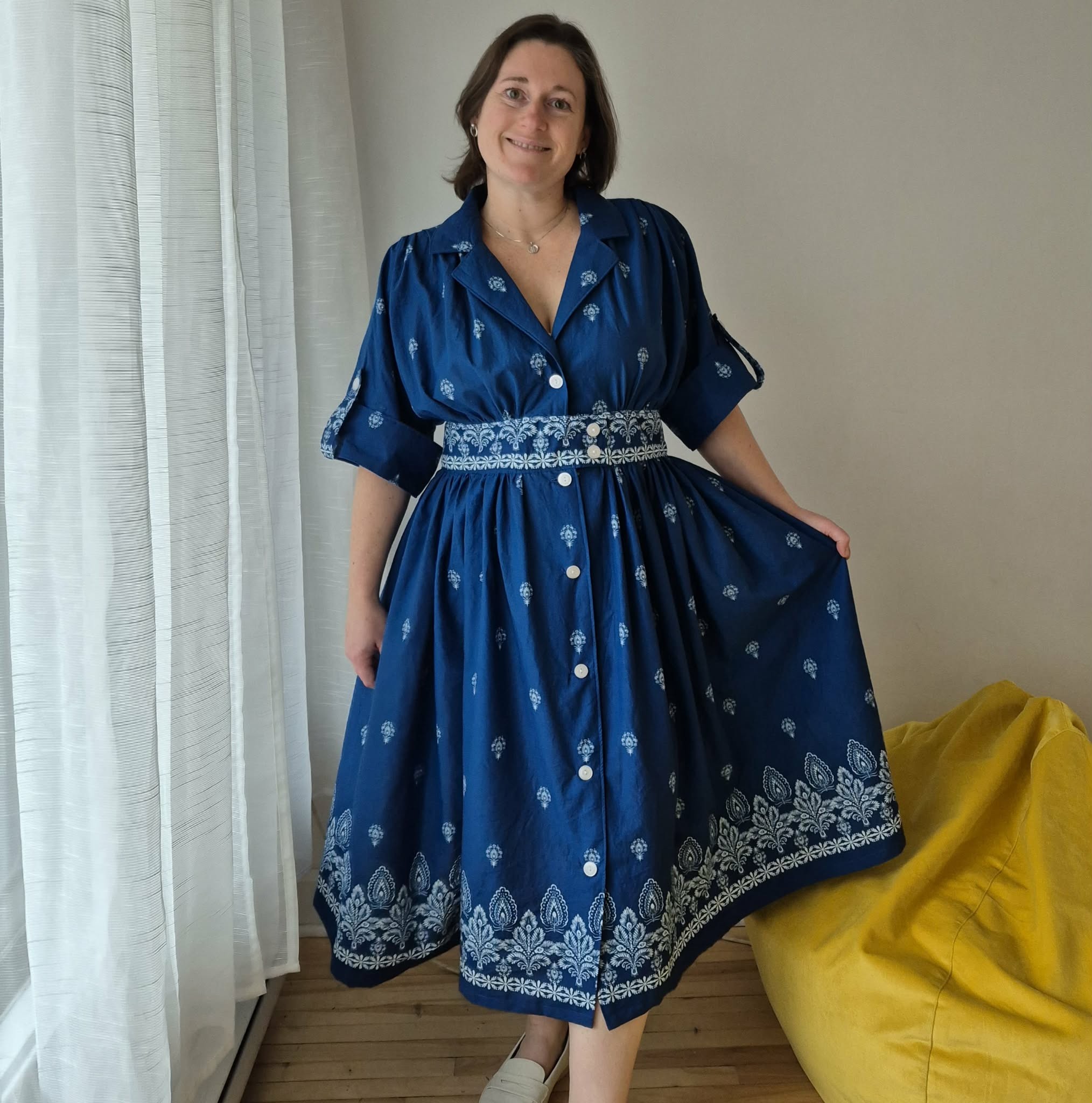 J’ai choisi une voile de coton de la collection Everyday Blues. Elle est légère, respirante et parfaite pour tous les fronces et le volume de ce modèle. Je ne recommanderais rien de trop lourd — cette robe s’épanouit dans des tissus aériens.