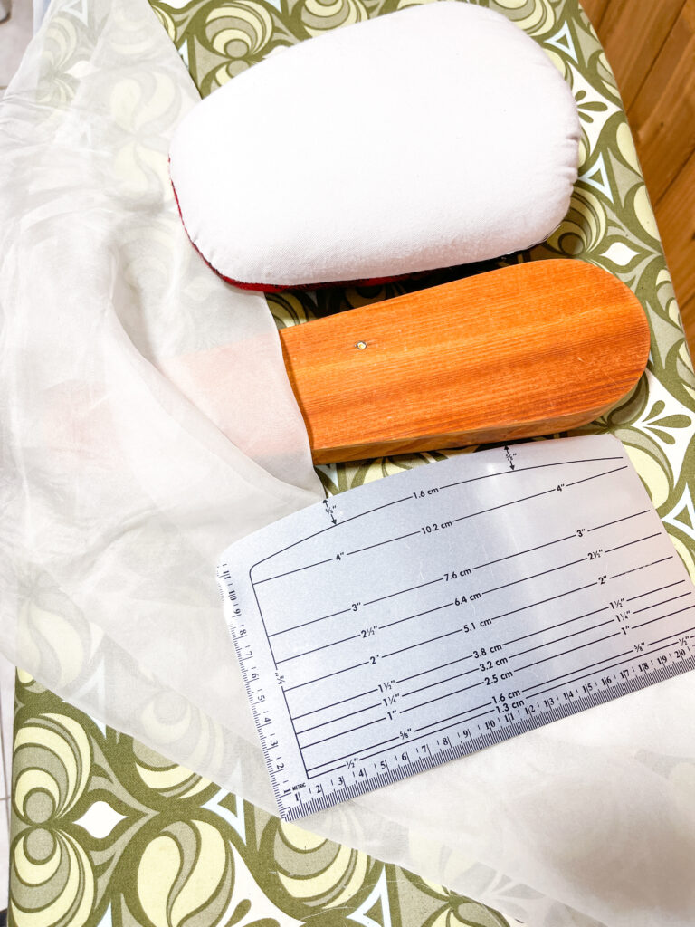 Great tools for pressing include tailors’ ham, wooden clapper, seam guide and silk organza pressing cloth