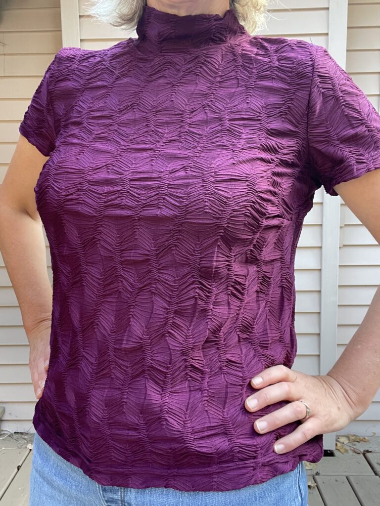 This fabric has a lot of texture to it.  It comes in a range of colours and I love this deep burgundy colour for fall. It’s my favourite colour and I’m so happy that it is trending this season. Due to the texture and scrunch effect, it can be a little bit trickier to sew. My suggestion is to baste the seams with your sewing machine first. I did that and had no problems with it. Then, serge or use a tiny zigzag stitch to secure the seams.