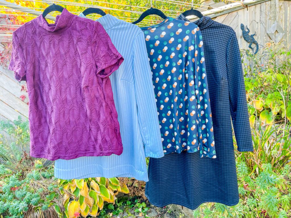 I used the Jalie Nicole pattern and created four different looks. These fabrics from the Fabricville autumn collection are wonderful, and I created four completely unique looks.  You likely wouldn’t even know it was the same pattern!